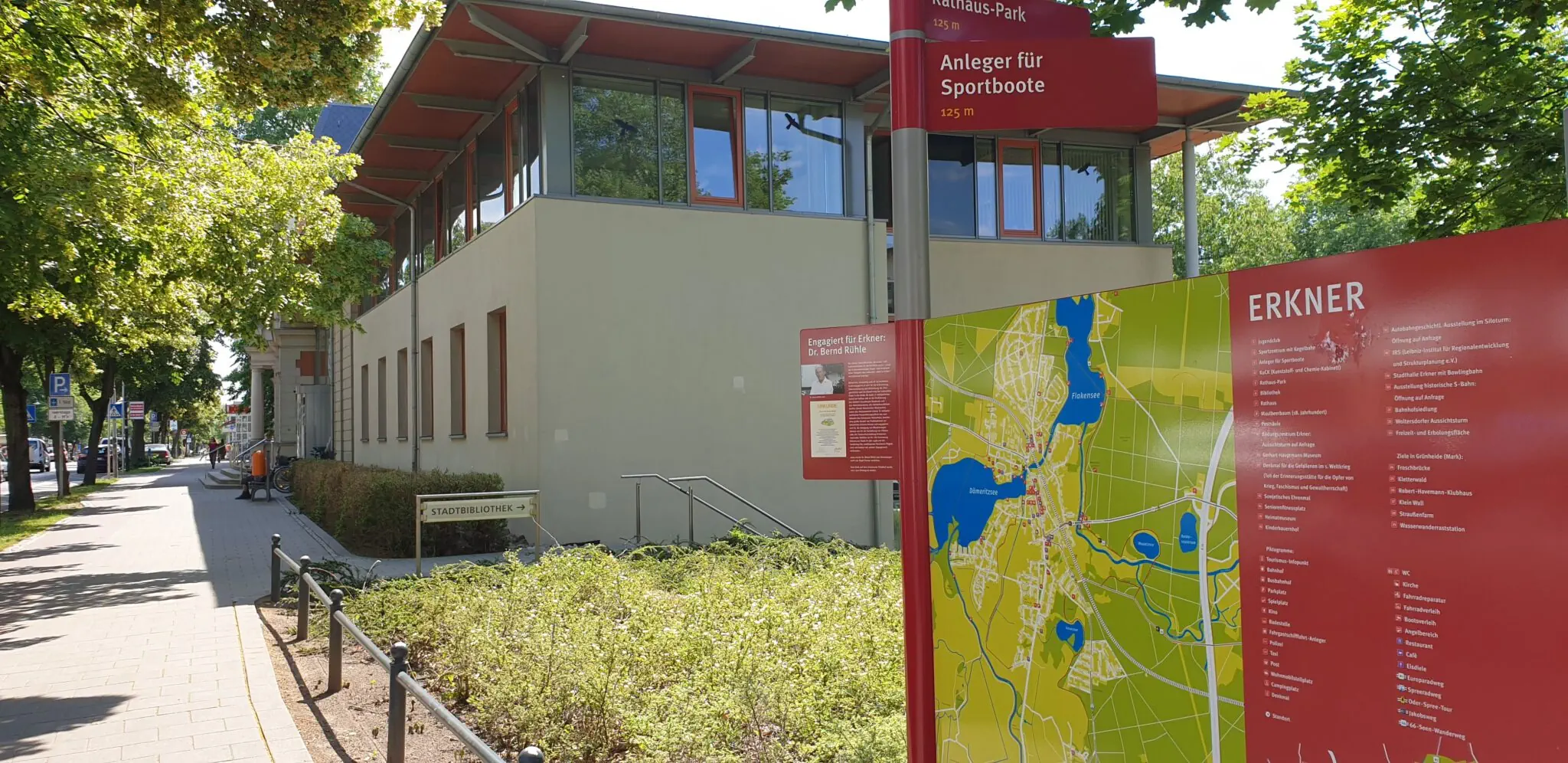 Fast alle denkbaren Erledigungen, wie Ärzte, Einkaufsmöglichkeiten, Schulen, Kitas, Bus- und S-Bahnhof, Rathaus, Sportzentrum wie auch Kino sind hier fußläufig erreichbar. Und wem das Leben im Zentrum zu manchen Zeiten zu lebendig wird, findet wunderbare Ruhe im Rathauspark mit angrenzendem Dämeritzsee – Sonnenuntergänge und Naturgenuss garantiert. Spaziergänger werden den „Bretterschen Graben“ lieben, der Im Rathauspark als kleiner Wanderweg beginnt. Er verbindet den Dämeritzsee mit der Spree und ist zu jeder Jahreszeit einen Spaziergang wert.