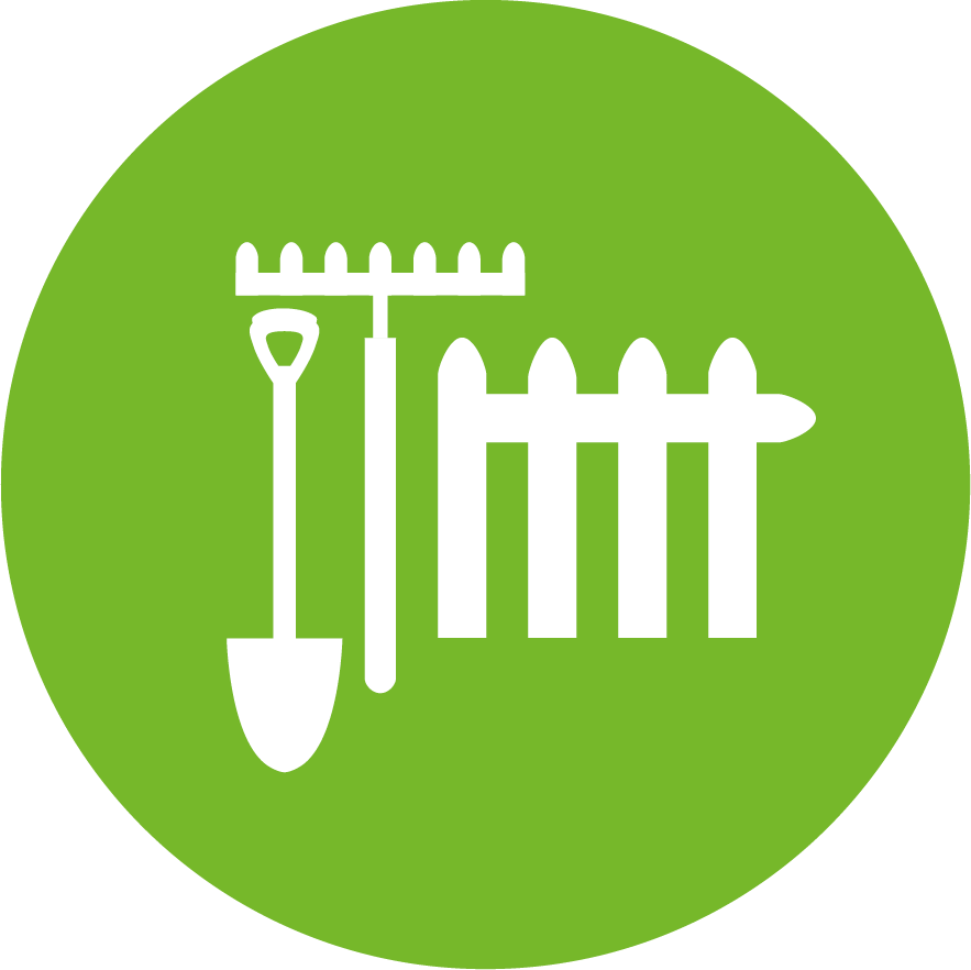 Weißes Piktogramm mit Spaten, Rechen und Gartenzaun auf grünem Kreis – steht für Gartenpflege, Außenanlagen und Grünflächenarbeit.